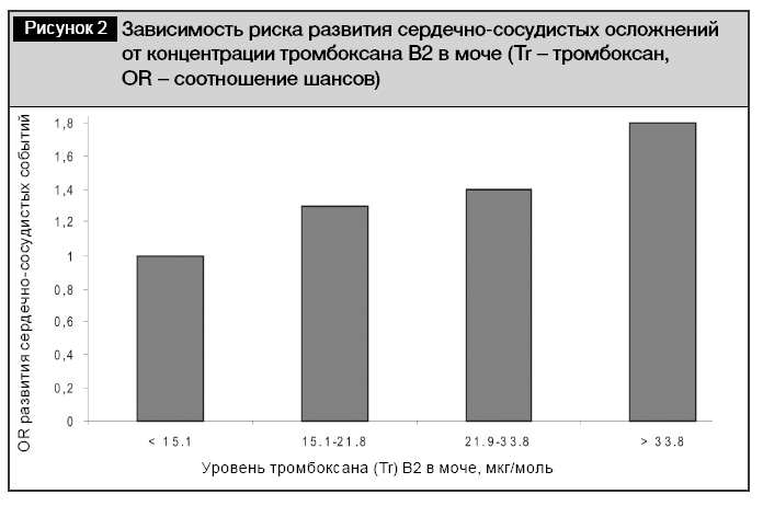 Согласно современным взглядам, резистентность к ацетилсалициловой кислоте характеризуется отсутствием депрессии функции тромбоцитов и снижением антитромбоцитарного эффекта АСК, что сопровождается повышением риска тромбоэмболических осложнений [15, 20, 25]. Биохимическая основа резистентности к АСК заключается в неполном ингибировании синтеза тромбоксана А2 и недостаточном снижении уровня агрегации тромбоцитов. В ряде исследований было доказано, что риск развития сердечно-сосудистых осложнений прямо пропорционален концентрации продуктов деградации тромбоксана – основных маркеров, которые используются для косвенной оценки эффективности антиагрегантной терапии и резистентности к АСК (рис. 2) [11].