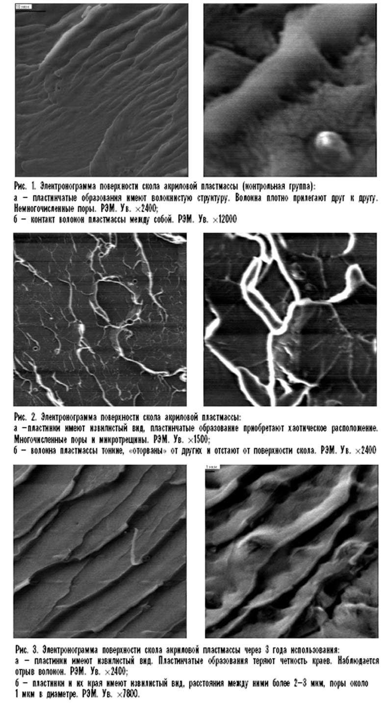 Таким образом, сравнительный анализ электронограмм образцов стоматологической базисной акриловой пластмассы непосредственно после ее изготовления, через 1, 2 и 3 года пользования ею показал значительные различия в структуре на продольных сколах.
