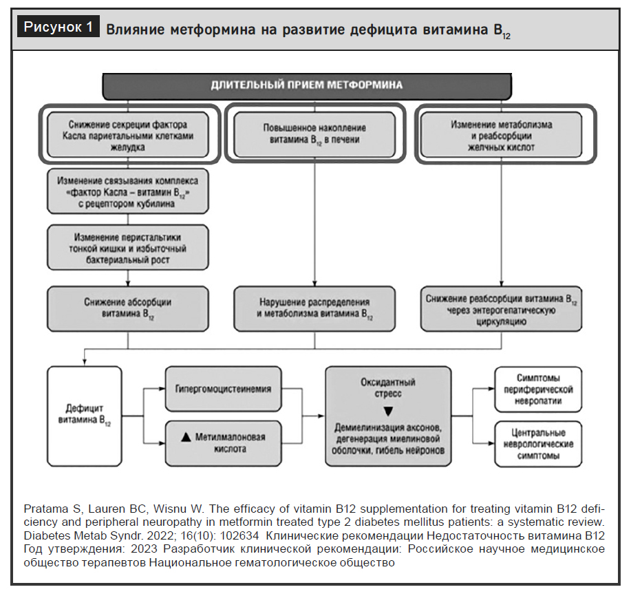 По мнению российских экспертов, у 30–50% пациентов с дефицитом витамина В12 наблюдается та или иная степень неврологического поражения, что имеет особое значение для лиц с сахарным диабетом (СД) [14, 15]. Неврологические симптомы могут проявляться симпотомокомплексом полинейропатии, когнитивными нарушениями, депрессивными проявлениями. Для пациентов с СД дефицит витамина В12 имеет особое значение, что связано с высокой распространенностью заболевания в пожилом возрасте, широким использованием метформина, актуальностью для этой категории пациентов различных проявлений нейропатии, акселерацией когнитивного дефицита, увеличением частоты выявления депрессивных нарушений и анемии, особенно часто манифестирующей при прогрессии хронической болезни почек [10, 16–19]. Как уже было указано, использование метформина связано со снижением концентрации витамина B12 в сыворотке крови. При этом эффект был продемонстрирован уже через 3 месяца после начала приема препарата, а его снижение связано с высокой частотой и худшими показателями нейропатии [10, 20–22]. Также доказана ассоциация дефицита витамина В12 и кардиоваскулярной автономной нейропатии [23]. Механизм влияния метформина на развитие дефицита витамина В12 включает снижение секреции внутреннего фактора Касла, повышение накопления витамина В12 в печени, изменение метаболизма желчных кислот с последующим развитием гипергомоцистеинемии и активацию оксидативного стресса (рис. 1) [24, 25].