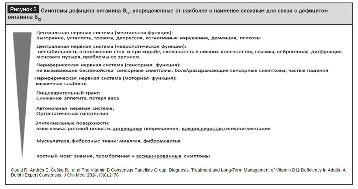 Группой экспертов после предварительного обзора литературы проведено обобщение результатов, касающихся различных аспектов диагностики и лечения дефицита витамина B12 с использованием модифицированного метода Дельфи для формирования экспертного консенсуса, ориентированного на практику и позволяющего определить подход к оказанию медицинской помощи людям с дефицитом витамина B12 и лицам с риском его развития [34]. Авторы пришли к согласованному заключению, позволившему сгруппировать данные по симптомам дефицита витамина В12 от наиболее часто встречающихся до более редких, свидетельствующему, что нейропсихиатрические симптомы доминируют по распространенности, но они менее специфичны, чем гематологические нарушения, что определяет сложности распознавания ассоциативных связей с дефицитом витамина В12 (рис. 2).