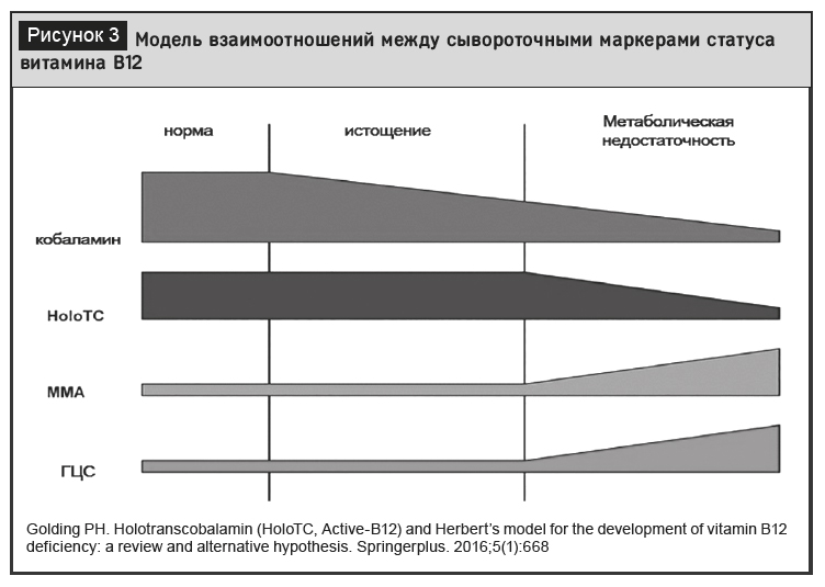 Альтернативная модель развития дефицита витамина B 12, отражающая взаимодействие между различными биомаркерами его статуса, приведена на рисунке 3 [40].